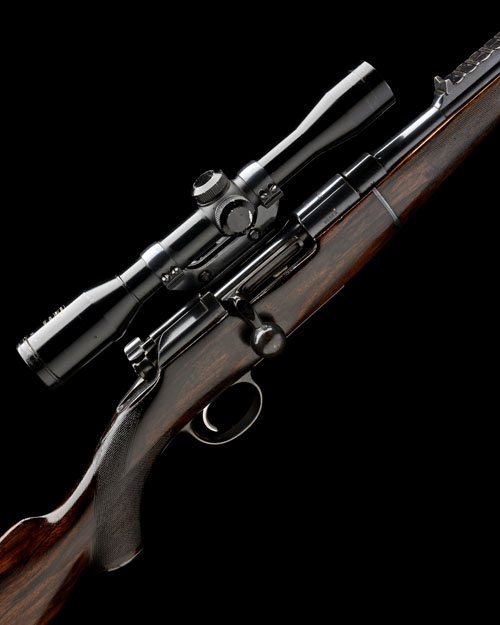 26in. nitro barrel engraved 'GEORGE GIBBS. BRISTOL & 35 SAVILE ROW. LONDON. W.', open sights with four folding leaf sights for 100, 200, 300, 400 and 500 yards, block-mounted bead fore-sight, receiver mounted with a Kassnar Beta 3 4x32 telescopic sight on a quickly-detachable side-rail, detachable box magazine, hollowed round bolt handle, boldly-figured pistolgrip stock with steel pistolgrip-cap and buttplate, sling eyes, 14 1/4in. pull