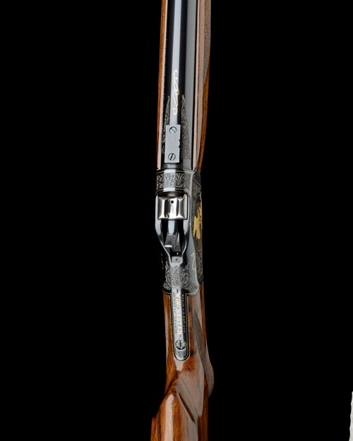 26in. heavy unsighted nitro reproved barrel with gold detailing at the muzzle and breech ends, the left side stamped 'KEN EYSTER HERITAGE GUNSMITHS 225 WINCHESTER', and with telescopic sight mount rails, black action carved in relief with acanthus scrollwork and with central vignettes of wildlife, carved in relief and inlaid in gold, the left side with a pair of beavers, on the right a bird of prey attacking a gopher, the top tang with 'REG IN US PAT OFF. TRADE MARK' and central gold-inlaid 'WINCHESTER' detail, the triggerguard tang gold-inlaid with the serial number, beavertail fore-end, 14in. pistolgrip stock with cheekpiece, sling eyes and chequered steel buttplate, weight 8lb. 15oz.