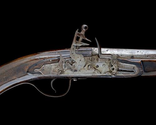 circa 1620, with triple staged 14in. iron barrel (slightly shortened and small crack at muzzle), armourer's stamp of a letter 'H' and a crescent together with a shield-shaped device (the last partial), plain iron lock with tear-drop tail, pierced vertical frizzen bridle, replaceable pan, screwed hammer-stop, squared hammer and swinging hammer safety, plain walnut full-stock with carved apron around the top-tang, plain butt swelling at the pommel with iron band reinforcement, sheet-iron trigger-guard bow fixed from the underside, three large side-nails, iron reinforcing band at muzzle and replacement iron tipped ramrod