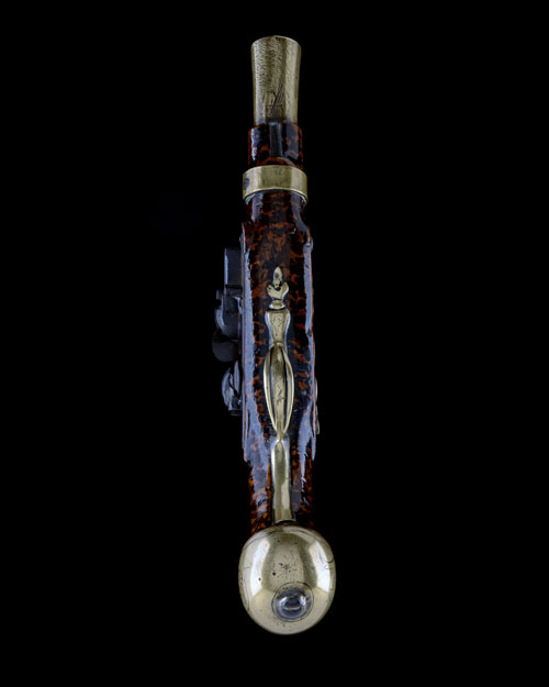 English circa 1750 and probably by Richard Sinclair, London, with heavy triple-staged 7 3/4in. barrel (heavily cleaned with loss to detail and sharp edges), makers mark 'R.S' surmounted with a fleur de lys and London proofs at breech, traces of scroll engraving to the top and side flats, iron top-tang, plain bevel edged iron lock with pointed tail, walnut three-quarter stock with false figuring, apron with tear-drop terminal carved around top-tang, heavy borderline and scroll engraved brass butt-cap, brass tang and trigger-guard bow with pinched pillars, sideplate in the form of a coiled serpent, additional heavy brass barrel-band fitted in antiquity, provision for ramrod (missing), fore-end tip possibly cut back, loss to wood around lock