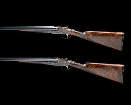 27 1/4in. nitro chopperlump barrels with matt Churchill style ribs, gold-inlaid '1' and '2' at the breech ends, tubes engraved "PARSA" EIBAR, 2 3/4in. chambers, bored approx. 1/4 and 1/2 choke (No.1) and 1/2 and 1/4 choke (No.2), wall thicknesses below recommended minimum, treble-grip actions with hidden third bites and side-clips, removable striker discs, toplevers gold-inlaid '1' and '2', automatic safeties, gold-inlaid cocking-indicators, non-selective gold-washed single triggers, rolled-edge triggerguards, fine acanthus scroll engraving with floral bouquets, the lockplates and undersides signed 'J.M. URRIOLA', retaining much original colour-hardening and finish, 14 7/8in. highly-figured stocks including 3/8in. ventilated rubber recoil pads, weight 6lb. 4oz. (No.1) and 6lb. 1oz. (No.2)