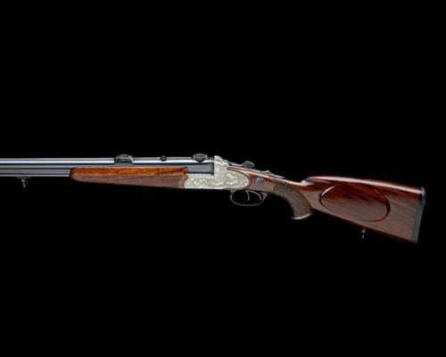25 1/8in. nitro barrels with raised matt rib, open sights and ramp-mounted bead fore-sight, the breech end with quickly-detachable telescopic sight mount bases with mounts, 2 3/4in. shot chamber, bored approx. 3/4 choke, quadruple-grip action with side-bolsters, removable striker discs, tang-mounted shot / ball selector switch, manual side safety, set front trigger, bold Germanic scroll engraving with oak leaf and acorn designs, surrounding game scenes of roe deer, fox and hare, the underside with a wild boar and signed with with makers details, 14 3/8in. pistolgrip stock with cheekpiece, fish scale chequering, pistolgrip-cap, sling swivels and including 1/2in. rubber recoil pad, weight 7lb. 14oz. (not including mounts)