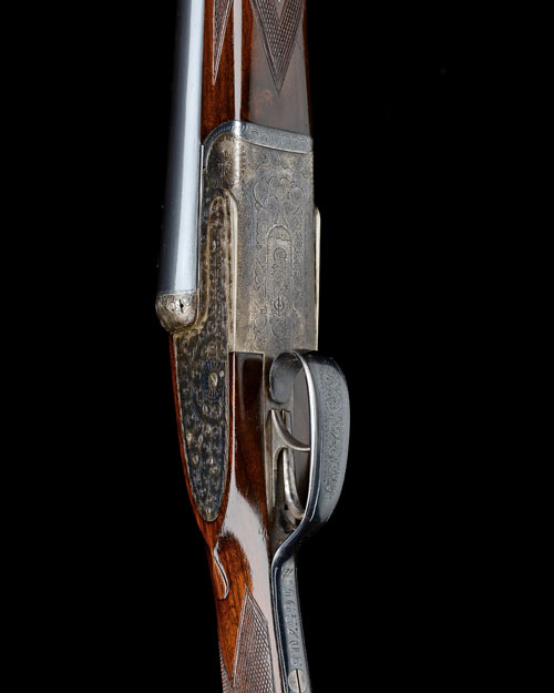 28in. nitro chopperlump barrels, 2 3/4in. chambers, bored approx. 1/4 choke in both, engraved arcaded fences, removable striker discs, automatic safety, gold-inlaid cocking-indicators, rolled-edge triggerguard, acanthus scroll engraving, retaining much original colour-hardening and finish, 14 5/8in. stock, weight 6lb. 9oz.