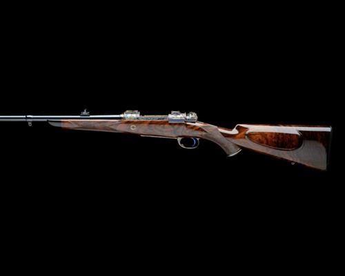 24 1/8in. nitro barrel gold-inlaid 'MANUFACTUR T. JUNG. LOHMAR', '-.375 H&H MAG.-', and with twin gold band details at the breech end, open sights with finely file cut finish with gold-inlaid sight line and marked for 100 metres, finely matted ramp-mounted gold bead fore-sight with gold line detailing and fold-over moonsight / protector, double square-bridge action with quickly-detachable telescopic sight mount bases with chequered tops and gold line bordering, colour-hardened bolt with progressive radial cut chequering and gold highlighting, engraved and colour-hardened recoil blocks with gold line border, hinged straddle floorplate with push button release, blued trigger, best acanthus scroll engraving overall, retaining virtually full colour-hardened finish, highly-figured pistolgrip stock with cheekpiece, colour-hardened and engraved steel pistolgrip-cap and sling eyes, 15in. pull including 1/2in. rubber recoil pad
