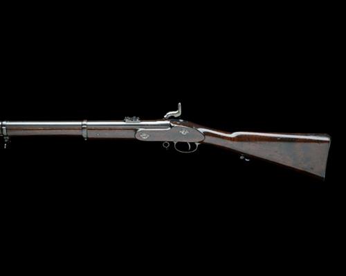 dated for 1858 and updated to 1861 specification by the fitting of a five-groove rifled 24in. barrel, block and blade fore-sight, 600 yard ladder rear-sight, plain lock signed 'TOWER' and marked with the date and a Queen's crown to tail, walnut three-quarter stock with iron furniture, jag-ended iron ramrod and bayonet lug to the right side of muzzle, refinished throughout