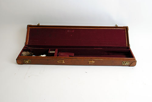 A LEATHER SINGLE GUNCASE, fitted for 30in. barrels, the interior lined with maroon baize, 2 x brass locks (keys missing),handle missing