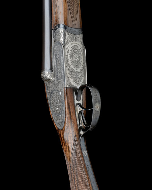 27 5/8in. (70cm) nitro chopperlump barrels with raised matt rib, 2 3/4in. chambers, bored approx. 1/4 and full choke (some rivelling), treble-grip action with hidden third bite, removable striker discs, manual safety, articulated front trigger, floral and acanthus scroll engraving, bright finish, 14 1/4in. stock with sling swivels and including buttplate, weight 6lb. 7oz., in a vinyl case