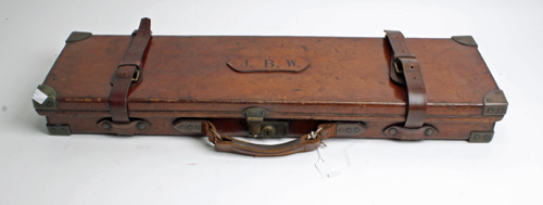 A BRASS-CORNERED LEATHER SINGLE HAMMERGUN CASE,