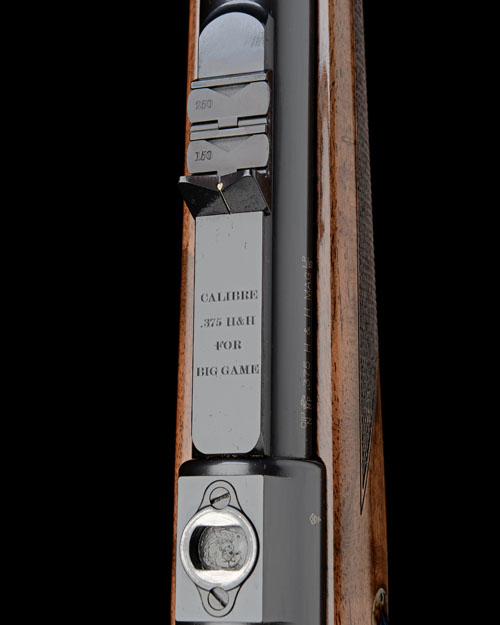 24in. nitro barrel engraved 'JOHN RIGBY & CO. 13 - 19 PENSBURY PLACE, LONDON SW8', sight rib with open sights and two folding leaf sights and engraved 'CALIBRE .375 H&H FOR BIG GAME', Mauser M98 Magnum receiver with quickly-detachable telescopic sight mount bases, colour-hardened recoil blocks, hinged straddle floorplate with push button release, well-figured pistolgrip stock with cheekpiece, colour-hardened steel pistolgrip-cap (with trap), sling swivels, 14 13/4in. pull including 1in. rubber recoil pad, weight 10lb. 7oz.