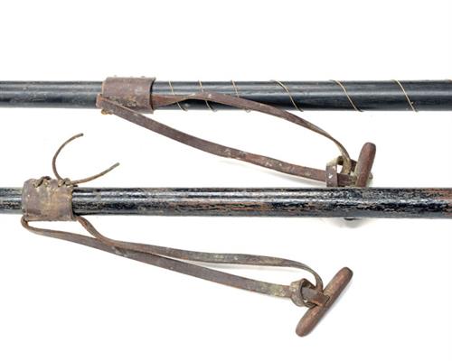 pre World War One, probably Continental, with triangular tapering 8in. tips not including re-enforcing spurs, concave sides to the tips, heavy semi-pointed heel-caps also with re-enforcing spurs, black stained hardwood shafts, approximately 113in. overall length and fitted with leather wrist straps and swallow-tail pennants in the national colours of Belgium (2)