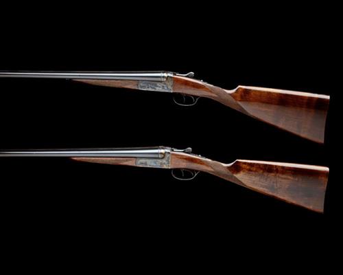 27in. nitro chopperlump barrels, ribs gold-inlaid '1' and '2', 2 3/4in. chambers, bored approx. true cyl. and 3/4 choke (No.1) and 1/4 and 3/4 choke (No.2), toplevers gold-inlaid '1' and '2', removable striker discs, automatic safeties, border engraved actions retaining virtually full original colour-hardening and finish, 14 1/2in. stocks, weight 5lb. 13oz., in a wood case with paperwork