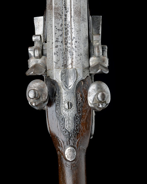 French, early 19th century, with 32 1/2in. triple-staged barrels, flat locks with raised pans, engraved iron mounts including trigger-guard with urn finial, walnut half-stock carved in relief with a dragon-mask behind the grip, chequered grip and fore-end, associated ramrod, exposed iron surfaces of barrel with some pitting