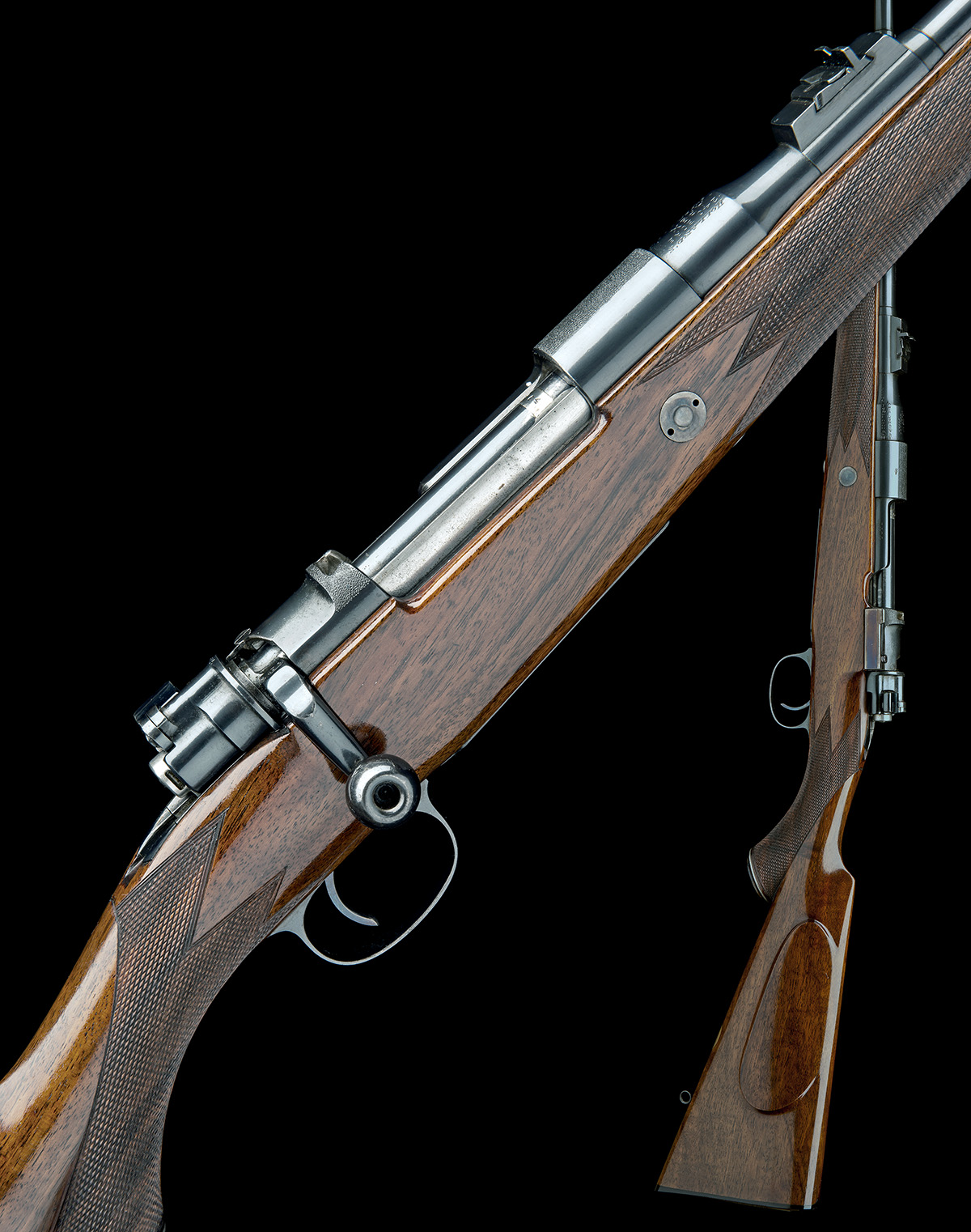 23 1/4in. nitro barrel engraved 'HOLLAND & HOLLAND. 98. NEW BOND ST. LONDON.' the knox form engraved 'HOLLAND'S .240 BORE APEX SUPER EXPRESS RIFLE', block-mounted open sights with folding leaf sight marked '50/200' and '350', ramp-mounted bead fore-sight with folding protector hood, matt top receiver ring, the sidewall (with thumb cutout) engraved with the serial number, colour-hardened recoil blocks, detachable floorplate with military style release, pistolgrip stock with cheekpiece, colour-hardened steel pistolgrip-cap (with trap), sling eyes, 14 1/8in. pull including buttplate, weight 6lb. 14oz., with a Mid-Norsk Transportkasser A/S alloy flight case