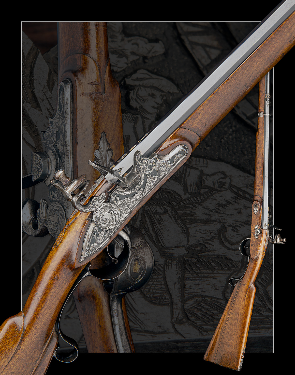 German circa 1725, with 36in. swamped blued two-stage sighted barrel with chiselled band at the intersection heightened with gold, silver star-burst fore-sight, breech-section with gold-lined maker's stamps, gold-lined touch-hole, flat bevelled lock signed 'MATH. BRAMHOFFER, AUGSPURG' (sic) and chiselled in low relief with a hunting scene against a blackened ground, inset sculpted and engraved hammer and frizzen bridle, walnut three-quarter stock, border engraved iron mounts, later horn-tipped ramrod.