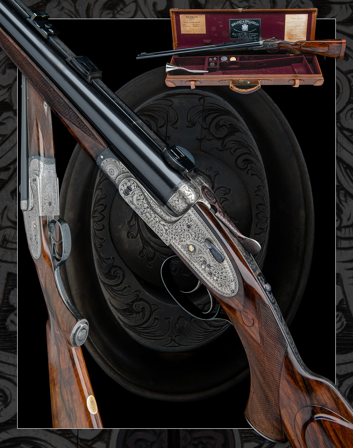 25in. nitro reproved chopperlump barrels (London reproof in 1985) converted to rimless from flanged, matt sight rib with open sights and folding leaf sight, marked 50, 200, 150 and 350, ramp-mounted bead fore-sight with fold-over protector / moonsight, the breech end with quickly-detachable telescopic sight mount bases, the rib engraved ' .30 "SUPER" RIMLESS', tubes engraved 'HOLLAND & HOLLAND. 98. NEW BOND STREET, LONDON.', the underside of the barrels engraved 'CONVERTED TO RIMLESS BY J. RIGBY & CO. LONDON.', and 'MADE IN ENGLAND' to the under rib, treble-grip action with hidden third bite and side-bolsters, elongated top strap, automatic safety with gold-inlaid 'SAFE' detail, hand-detachable lockplates, gold-inlaid cocking-indicators, articulated chequered front trigger, rolled-edge triggerguard, best bold Royal scroll engraving, the underside with an elaborate cartouche engraved 'ROYAL MODEL', bright and reblued finish overall, 14 1/8in. boldly-figured pistolgrip stock (chequering refreshed) with cheekpiece, engraved steel pistolgrip-cap (with trap), sling swivels and including 1in. rubber recoil pad, weight 8lb. 9oz., in its lightweight leather case with Holland & Holland labels and also John Rigby & Co. 'calibre/regulated for' label