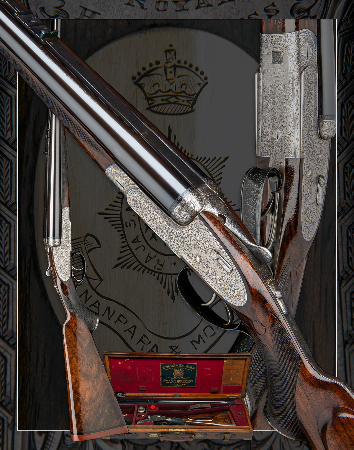 26in. nitro chopperlump barrels, matt sight rib with open sights and two folding leaf sights marked 100, 200 and 300, ramp-mounted bead fore-sight with flip-up moonsight, treble-grip action with hidden third bite, removable striker discs, toplever engraved 'ROYAL EJECTOR', elongated top strap, automatic safety with gold-inlaid 'SAFE' detail, hand-detachable lockplates, gold-inlaid cocking-indicators, cocking lever return studs, articulated matted front trigger, rolled-edge triggerguard, best bold Royal scroll engraving, the underside with an elaborate cartouche engraved 'ROYAL HAMMERLESS EJECTOR', bright and reblued finish overall, 14 5/8in. figured pistolgrip stock with cheekpiece, engraved steel pistolgrip-cap (with trap), sling swivels, gold oval escutcheon engraved with a star surmounted by a crown and with central monogram 'SMSAK' and 'RAJA S.M. SAADAT ALI KHAN', below a scrolling banner engraved 'NANPARA & MOHAMDI', 3/4in. rubber recoil pad, weight 10lb. 7oz., in its brass-cornered oak and leather case