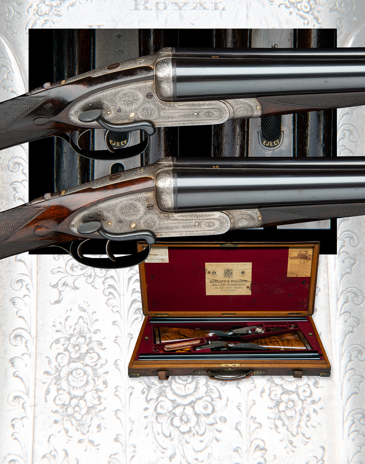30in. nitro barrels, the ribs with acanthus scroll detailing and gold-inlaid '1' and '2', the tubes engraved 'HOLLAND & HOLLAND. 98. NEW BOND STREET. LONDON.', 2 1/2in. chambers, bored approx. true cyl. and imp. cyl. choke, top tangs with oval cartouches gold-inlaid '1' and '2', automatic safeties with gold-inlaid 'SAFE' details, gold-inlaid cocking-indicators, fine acanthus scroll engraving with floral bouquets, the undersides with oval cartouches engraved 'ROYAL HAMMERLESS EJECTOR', some finish renewed, 14 1/4in. highly-figured stocks (shortened, the case retaining approx. 5/8in. removed sections), the fore-end irons mounted with chequered ejector on/off switches with gold-inlaid 'EJECT' details, weight 6lb. 15oz., in their brass-cornered oak and leather case