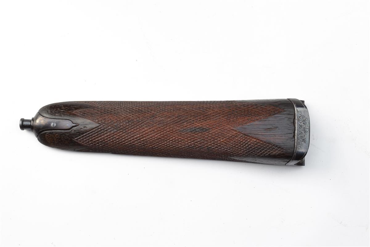 serial number on barrels only, 24in. Krupp-steel nitro barrels (Birmingham proofed CORDITE 55 - 400MAX) with file cut rib, open sights and four folding leaf sights, marked for 100, 200, 300, 400 and 500 yards, ramp-mounted bead fore-sight (possible replacement or re-fitted), the tubes engraved 'W. J. JEFFERY & CO. LTD. 13 KING STREET. ST. JAMES'S ST. LONDON.', light pitting to throat of chambers, treble-grip action with removable striker discs, automatic safety with gold-inlaid 'SAFE' detail, the fences with stippled finish, bold acanthus scroll engraving surrounding game scenes of buffalo (later or possibly refreshed), brushed bright and reblued finish overall, replacement triggerguard, 15in. native replacement pistolgrip stock (crack at head) with pistolgrip-cap and including 1in. ventilated rubber recoil pad, fore-end wood (possible replacement) with likely replacement finial and crack to wood, weight 10lb. 11oz.