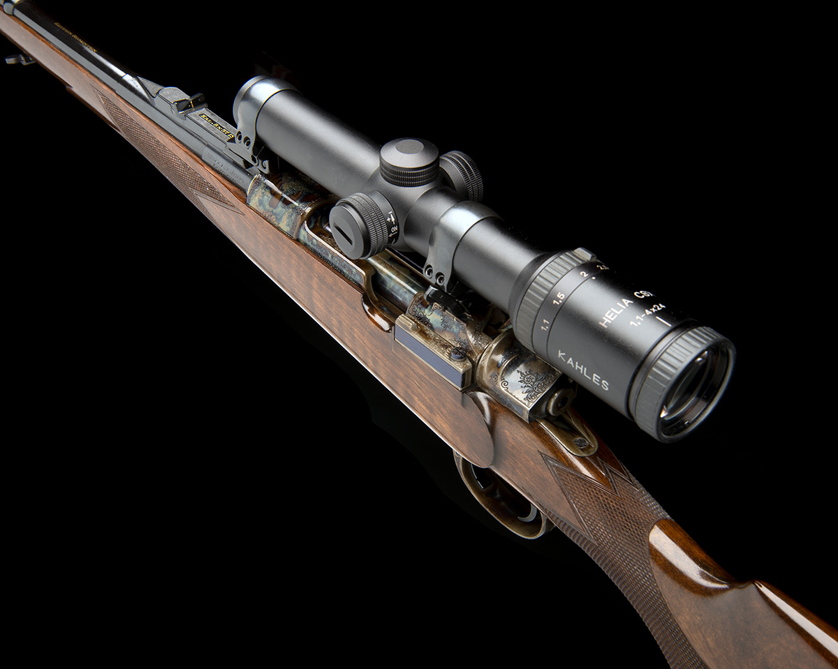 20in. nitro reproved barrel (in 2020) gold-inlaid 'EDITION ROMINTEN', finely matted sight rib gold-inlaid 'KAL. 8x57IS', open sights with gold-inlaid sight line and marked 100, ramp-mounted pyramid fore-sight, the receiver (with thumb cutout) mounted with a Kahles Helia CSX 1,1-4x24 telescopic sight, serial no. 587453L, in quickly-detachable mounts, gold line detailing at the knox form, colour-hardened bolt with progressive radial cut chequering and gold highlighting, safety with gold-inlaid 'F' detail, hinged floorplate with push release, receiver and furniture with fine acanthus scroll engraving and retaining virtually full colour-hardened finish, the sidewall engraved 'DEUTSCHE WAFFEN-UND MUNITIONSFABRIKEN. BERLIN.', highly-figured pistolgrip full length stock with cheekpiece, engraved and colour-hardened steel pistolgrip-cap, sling swivels, 14 5/8in. pull including 7/8in. leather covered recoil pad, weight 8lb. 8oz. (with scope)
