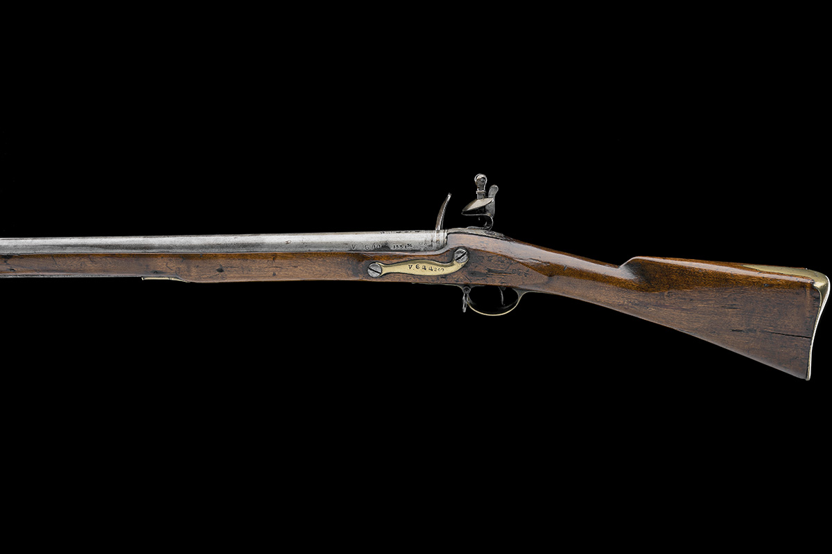 circa 1780 and of jager form, with browned octagonal swamped 28 1/4in. barrel, applied white-metal fore-sight, centre standing notch rear-sight with additional folding leaf and further standing notch rear-sight to front of top-tang, replacement rainproof lock signed 'INNES' (undersized, original lock aperture filled), walnut full-stock (cracked and repaired at hand) with carved raised borders around the furniture, carved apron around the top-tang, raised cheek-piece, brass furniture (sideplate replaced) and replacement ramrod, some filled repairs to fore-end, overall length 43in., weight approximately 7 1/2lbs.