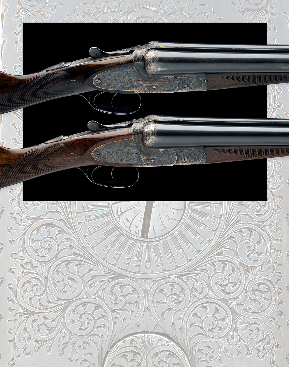 circa 1954, 28in. nitro barrels, the ribs engraved 'COGSWELL & HARRISON LTD. "KONOR" 168 PICCADILLY. LONDON.' and gold-inlaid '1' and '2' at the breech ends, 2 3/4in. chambers, bored approx. 1/4 and 1/2 choke (No.1) and imp. cyl. and 1/2 (No.2), toplevers gold-inlaid '1' and '2', automatic safeties with gold-inlaid 'SAFE' details, acanthus scroll engraving with floral bouquets, retaining much original colour-hardening and finish, 14 1/2in. figured stocks, weight 6lb. 9oz., in their leather case
