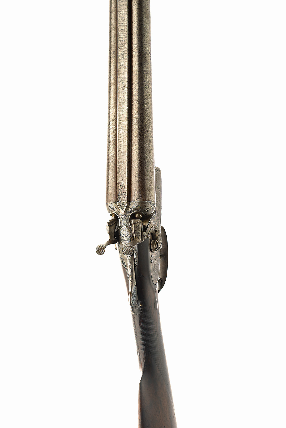 W.P. JONES 12-BORE TOPLEVER HAMMERGUN, serial no. 1652, pre-1875 proof marks, 29 3/4in. nitro reproved damascus barrels (poorly shortened), rib engraved 'W.P. JONES. MAKER. WINNER AT THE LONDON FIELD GUN TRIAL OF 12 16 & 20 BORE GUNS. 1879. 75 BATH ST. BIRMINGHAM.', 2 1/2in. chambers, bored approx. 1/4 and 1/2 choke, carved percussion fences, rebounding locks, border and acanthus scroll engraving, 14in. stock including steel buttplate, weight 6lb. 12oz.