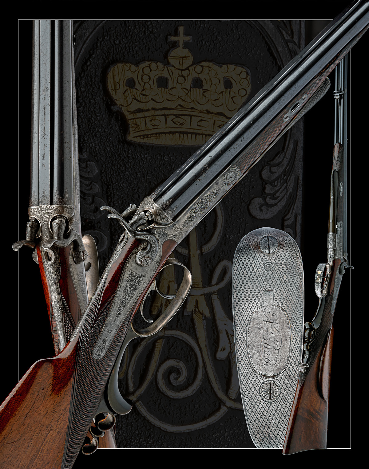 circa 1880, with blued 24 5/8in. side-by-side barrels, the flat raised top-rib signed in script 'J NOWOTNY HOFBUCHSENMACHER IN PRAG', dove-tailed blade fore-sight with auxiliary pop-up bead, adjustable notch ramp-rear-sight with additional folding leaf, scroll engraved rounded action-body, the engraving extending forwards onto breech-ends and rib of barrel, engraved flip-up flush fitting peep-sight mounted into the top-tang, border and scroll engraved back-action locks signed in banners 'J. NOWOTNY' on the left and 'A PRAGUE' on right, engraved dolphin-headed hammers, chequered walnut butt-stock with raised cheek-piece, iron heel-plate with central cartridge trap and moulded and carved horn tang-cover, single set triggers for both barrels, the trigger guard bow engraved with scrolls around a central panel inlaid with a gold crown over 'A', chequered walnut splinter fore-end with forward-facing chequered horn swing under-lever, cross-key barrel fastener and iron sling swivels
