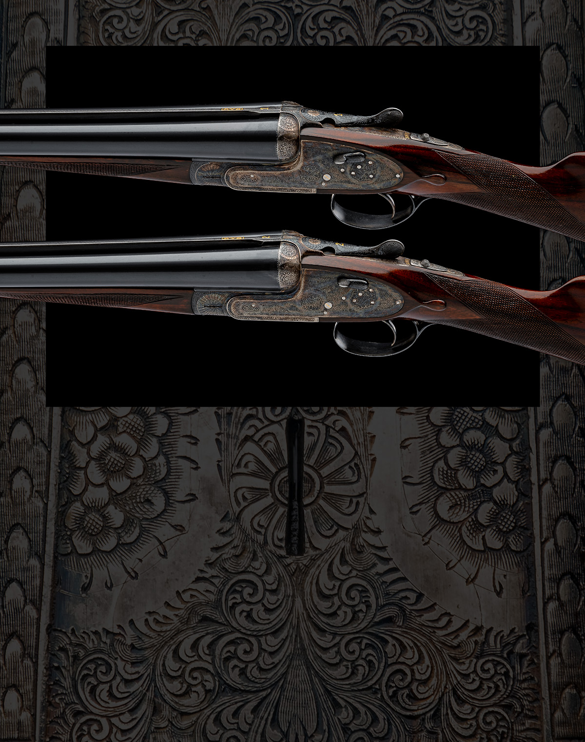 for 1977, 25in. nitro chopperlump barrels, matt Churchill-ribs gold-inlaid 'AYA' with '1' and '2' at the breech ends, 2 3/4in. chambers, bored approx. true cyl. and 1/2 choke (No.1) and true cyl. and 1/4 choke (No.2), toplevers gold-inlaid '1' and '2', automatic safeties with gold-inlaid 'SAFE' details, hand-detachable lockplates, gold-inlaid cocking-indicators, non-selective single triggers, acanthus scroll engraving with floral bouquets, retaining some original colour-hardening and finish, 14 3/4in. stocks, weight 6lb. 5oz., in a leather case