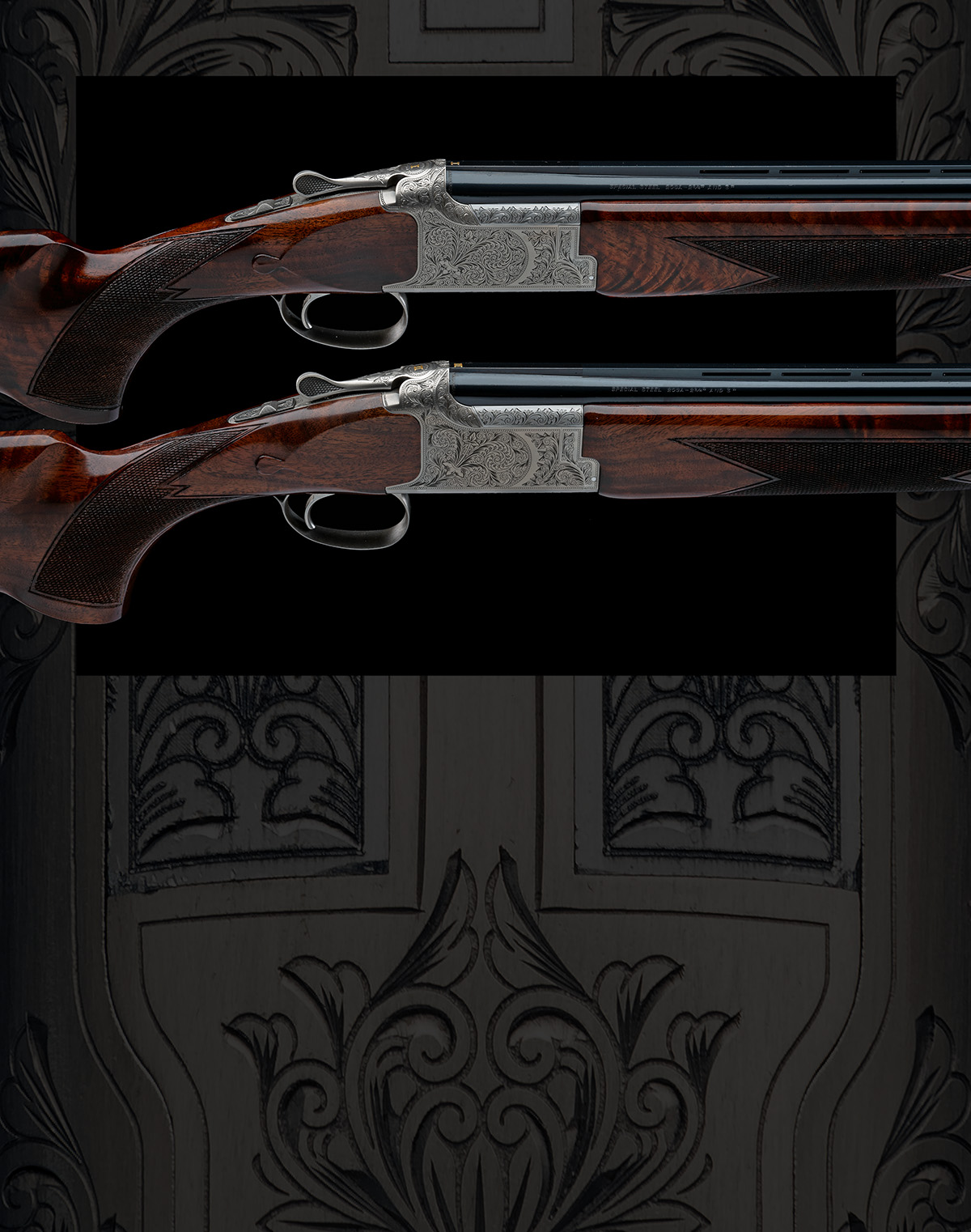 for 2017, 32in. nitro reproved barrels with 6mm ventilated matt top-ribs, gold-inlaid 'I' and 'II' at the breech ends, 3in. chambers, Teague multichokes (with spares), hold-open toplevers gold-inlaid 'I' and 'II', manual safeties with integral barrel selector switches, bold scrolling acanthus engraving with beaded bordering, silver finish, 15 1/8in. highly-figured pistolgrip stocks including 5/8in. Kick-Eez recoil pads, weight 7lb. 8oz., in a Browning suede leather motor case with original paperwork