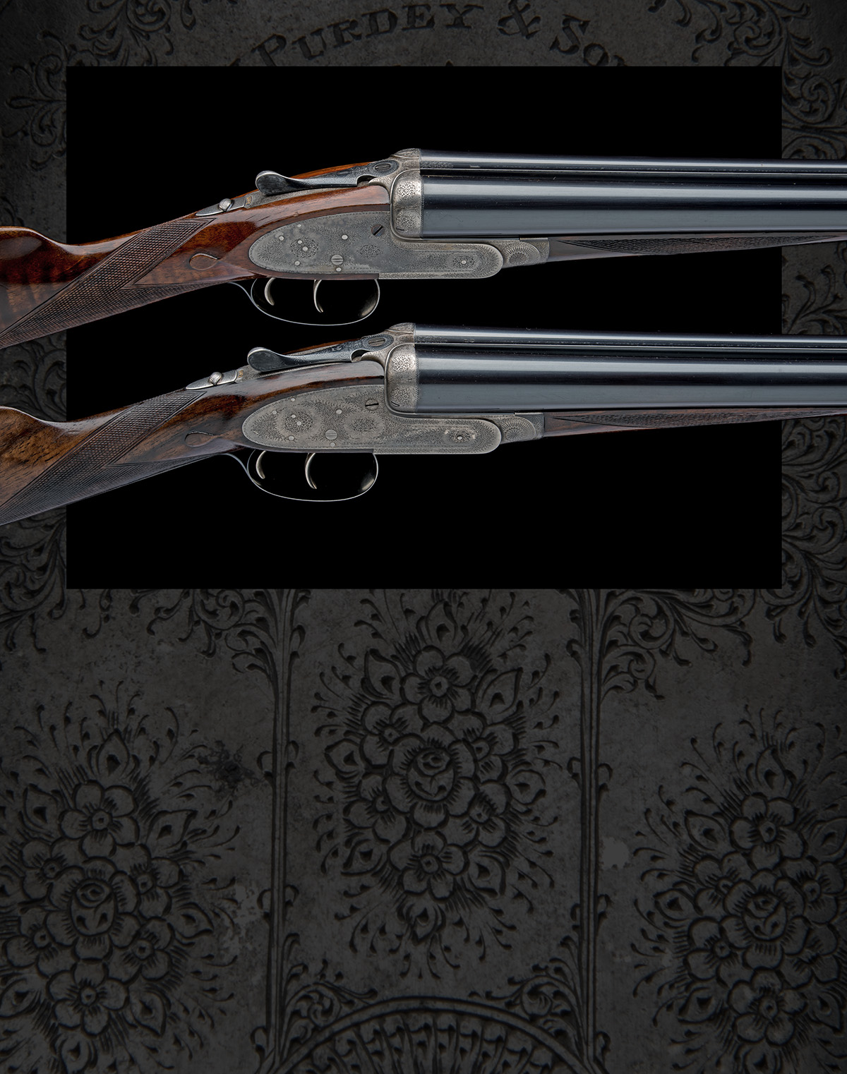 for 1924, 30in. Whitworth-steel nitro chopperlump barrels (No.2 reproved in 2024), the ribs engraved 'J. PURDEY & SONS. AUDLEY HOUSE. SOUTH AUDLEY STREET. LONDON. MADE OF SIR JOSEPH WHITWORTH'S FLUID PRESSED STEEL' and '1' and '2', 2 1/2in. chambers, bored approx. imp. cyl. both (No.1) and 2 3/4in. chambers, bored approx. true cyl. and 1/4 choke (No.2), toplevers engraved '1' and '2', automatic safeties with gold-inlaid 'SAFE' details, removable striker discs, cocking-indicators, best fine acanthus scroll engraving with floral bouquets, retaining slight traces of original colour-hardening, 16 1/2in. figured stocks including 1 7/8in. wooden extension (No.1) and 2in. wooden extension (No.2), No.1 a replacement, minor setting cracks to rear of top tangs, weight 7lb. 2oz. (No.1) and 6lb. 15oz. (No.2), in their brass-cornered oak and leather case