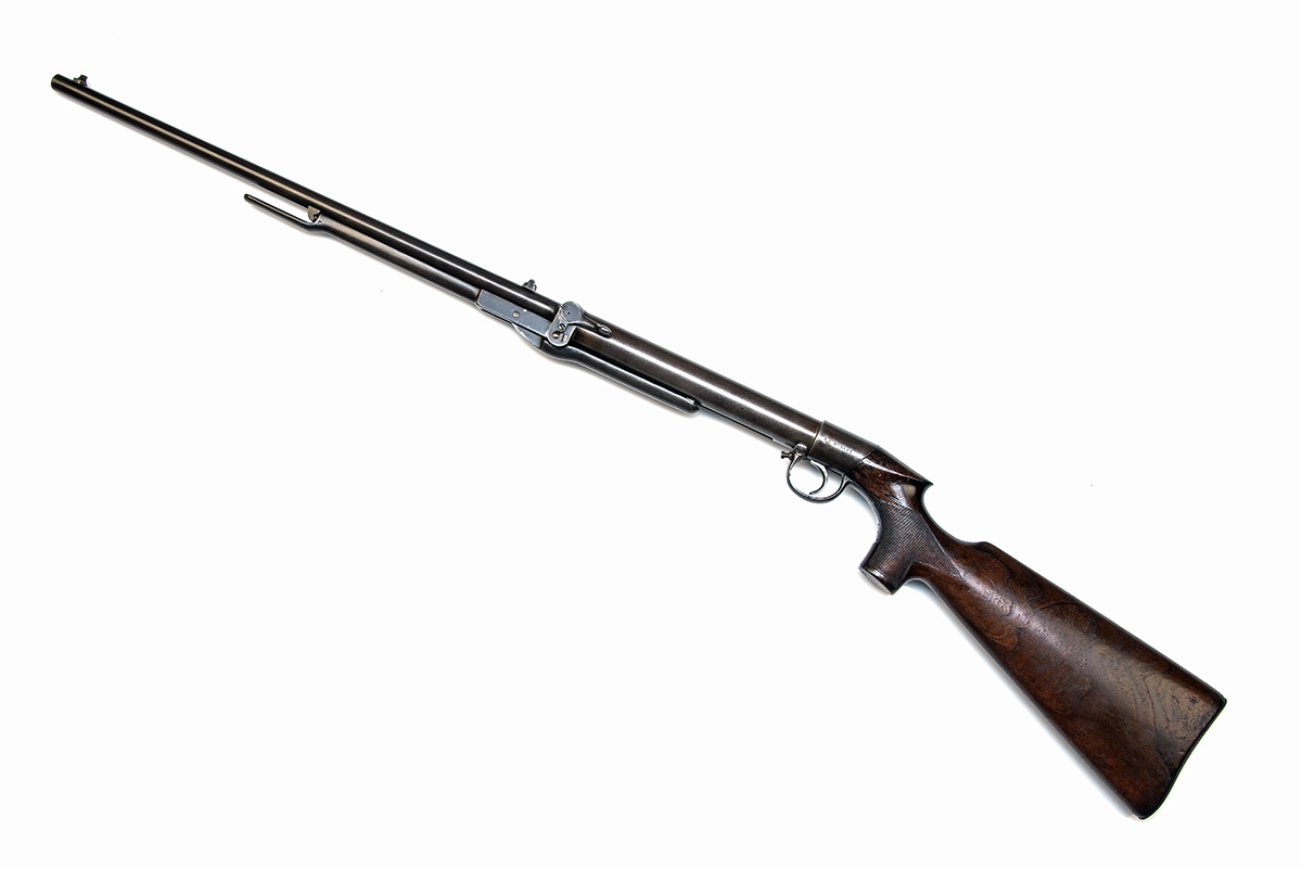 for 1906, with round tapering 19 1/4in. barrel, dove-tailed fore-sight, elevating notch rear-sight, handled loading tap at breech fitted with an articulated opening mechanism operated via a connection to the under-lever, plain air-chamber marked 'H' THE LINCOLN AIR RIFLE. PATENT.', single pin trigger unit with weight of pull adjuster, walnut chequered saw-handled butt-stock embossed on the right side of butt with 'REGISTERED LINCOLN JEFFERIES, INVENTOR & PATENTEE' and a depiction of a standing shooter above the legend 'G.B. TRADE MARK', iron heel-plate, no provision for fore-end and 'spade' catch under-lever