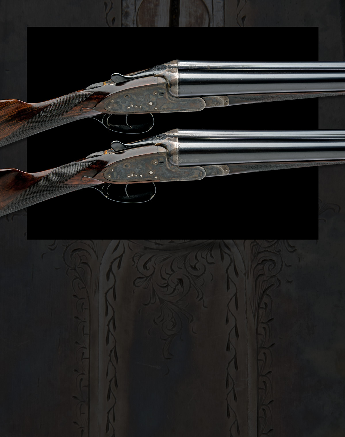 circa 1912, 30in. nitro reproved barrels (in 2025), the ribs engraved 'CHARLES LANCASTER'S W. & R. HAMMERLESS EJECTOR.' with '1' and '2' and a crown at the breech ends, 2 3/4in. chambers, bored approx. true cyl. and 3/4 choke, treble-grip actions with removable striker discs, toplevers engraved '1' and '2', automatic safeties with gold-inlaid 'SAFE' details, border engraving, the lockplates with central crown motifs, retaining much renewed colour-hardening and finish, 15in. figured replacement stocks including 1in. leather covered recoil pads, weight 6lb. 13oz. (No.1) and 6lb. 14oz. (No.2), in their brass-cornered oak-lined leather case