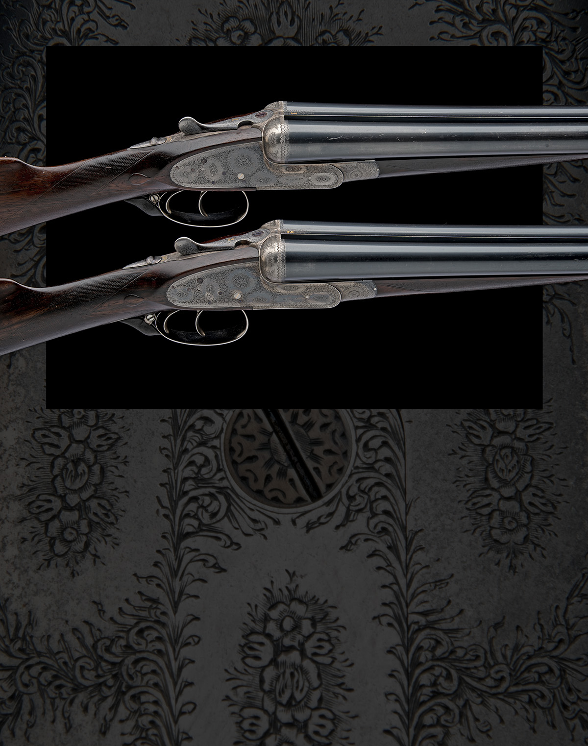 circa 1930, 29in. nitro chopperlump barrels, ribs engraved 'BOSS & CO. 41. ALBEMARLE STREET. PICCADILLY. LONDON. W.' and gold-inlaid '1' and '2', 2 1/2in. chambers, bored approx. imp. cyl. and 1/2 choke in all, No.1 right wall at 16, No.2 left wall at 18+, removable striker discs, toplevers gold-inlaid '1' and '2', automatic safeties with gold-inlaid 'SAFE' details, gold-inlaid cocking-indicators, rolled-edge triggerguards, best fine border and acanthus scroll engraving with floral bouquets, retaining traces of original colour-hardening and finish, 15in. stocks (worn, No.1 with minor crack at head), weight 6lb. 12oz. (No.1) 6lb. 13oz. (No.2), in their makers brass-cornered oak and leather double guncase with canvas and leather outer
