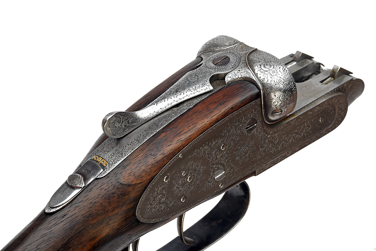 for 1910, 28in. nitro chopperlump barrels (loose on action), rib inscription rubbed, 2 1/2in. chambers, bored approx. true cyl. and imp. cyl. choke, bore dimensions marginal, removable striker discs, automatic safety with gold-inlaid 'SAFE' detail, cocking-indicators, best fine acanthus scroll engraving with floral bouquets, brushed finish, 14 3/4in. stock (worn and with cracks to head and hand, left overhorn springing), weight 6lb. 7oz.
