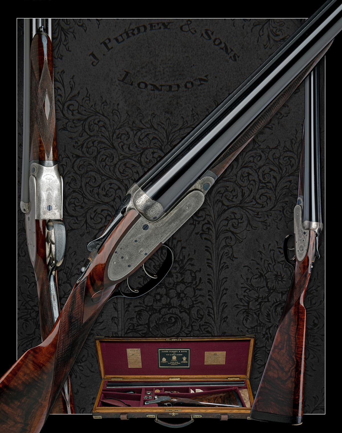 for 1912, 30in. replacement nitro chopperlump barrels with broad raised matt rib, the tubes engraved 'J. PURDEY & SONS. AUDLEY HOUSE. SOUTH AUDLEY STREET. LONDON. ENGLAND.', 2 3/4in. chambers, bored approx. 1/2 and full choke, large treble-grip action with hidden third bite and side-clips, removable striker discs, automatic safety with gold-inlaid 'SAFE' detail, cocking-indicators, fine acanthus scroll engraving with floral bouquets, retaining very slight traces of original colour-hardening and some renewed finish, blued pins, 15in. highly-figured replacement stock and matching fore-end wood, weight 7lb. 11oz., in its brass-cornered oak and leather case with some accessories