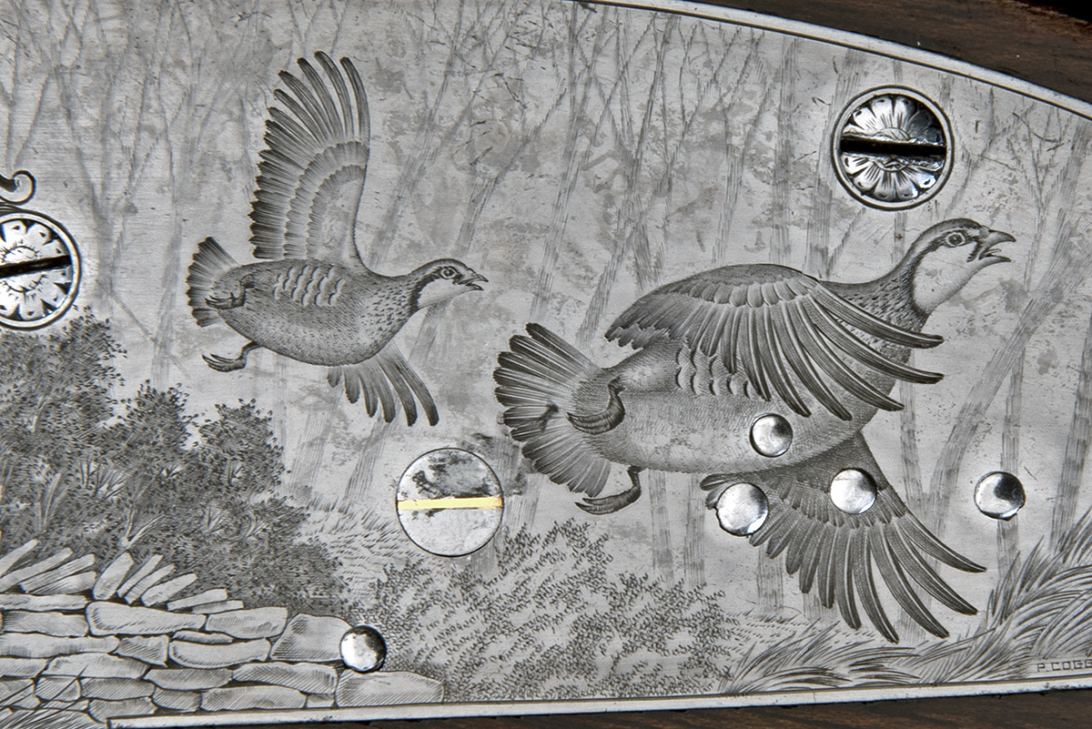 for 1991, 27in. nitro chopperlump barrels with tapered raised ventilated file cut top-ribs, gold-inlaid at the breech ends '1' and '2', side ribs, the over barrels engraved 'J. PURDEY & SONS. LONDON. ENGLAND.', 2 3/4in. chambers, multichokes (with spares), hold-open toplevers gold-inlaid '1' and '2', short side bolsters, automatic safeties with gold-inlaid 'SAFE' details, gold-inlaid cocking-indicators, non-selective single triggers, rolled-edge triggerguards, the action bodies and furniture carved in high relief with bold stylised foliage and leaf motifs on a finely matted background, the undersides with central scrolling banners engraved 'J. PURDEY & SONS', the lockplates finely engraved with scenes of game birds in their natural settings, No.1 gun with pheasant on the left and red grouse on the right, the No.2 gun with French partridge on the left and duck on the right, each scene signed 'P. COGGAN', the triggerguard tangs gold-inlaid with the serial numbers, 14 3/4in. highly-figured replacement pistolgrip stocks (by the makers in 2019) with engraved steel pistolgrip-caps, weight 6lb. 11oz., in their brass-cornered oak and leather case with complement of accessories and a canvas and leather outer cover