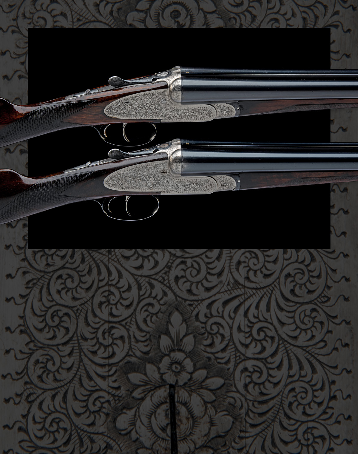 for 1974, 27 5/8in. (70cm) nitro barrels the ribs gold-inlaid 'I' and 'II' at the breech ends, the left tubes engraved in script 'Armi Famars', 2 3/4in. chambers, bored approx. 1/2 and full choke (No.I) and 1/4 and 1/2 choke (No.II), some minor pits, No.II left wall at 18, toplevers gold-inlaid 'I' and 'II', removable striker discs, automatic safeties, articulated front triggers, fully engraved with fine acanthus scrollwork interspersed with occasional floral sprays, the triggerplates signed 'R-VASCO-INC.', 16in. figured stocks, slightly cast on and swept for the left shoulder, including 1in. leather-covered recoil pads, weight 6lb. 13oz. (No.I) and 6lb. 14oz. (No.II), in a leather case