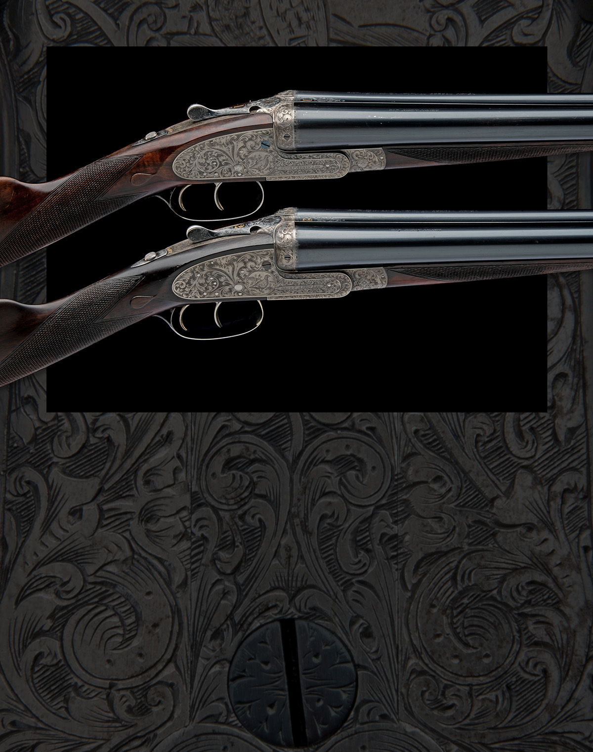 for 1967, 28in. nitro chopperlump barrels, ribs gold-inlaid '1' and '2' at the breech ends, the tubes engraved 'HENRY ATKIN LTD. 7, BURY STREET, ST. JAMES'S, LONDON, ENGLAND', 2 3/4in. chambers, bored approx. 1/4 and 1/2 choke, Atkin spring opening actions based on the Beesley / Purdey 1880 patent with 1909 model improved ejectors, removable striker discs, toplevers gold-inlaid '1' and '2', automatic safeties with gold-inlaid 'SAFE' details, articulated front triggers, profusely engraved in relief with bold scrolling acanthus on a file cut background and surrounding game scene vignettes of English game birds, bright finish, 15in. crossover stocks (right shoulder-left eye), minor setting cracks to rear of top tangs, fore-end finials gold-inlaid '1' and '2', weight 6lb. 10oz.