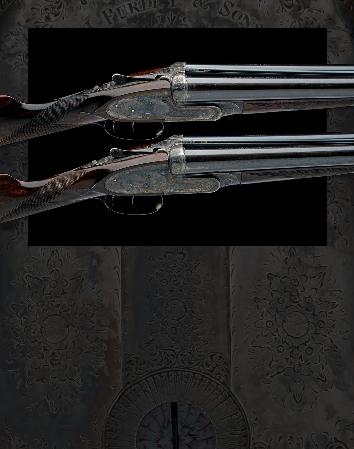 for 1988, 28in. nitro chopperlump barrels, the ribs gold-inlaid '1' and '2' at the breech ends, the tubes engraved 'J. PURDEY & SONS. AUDLEY HOUSE. SOUTH AUDLEY STREET. LONDON. ENGLAND.', 2 1/2in. chambers, bored approx. imp. cyl. and 1/2 choke, toplevers gold-inlaid '1' and '2', removable striker discs, automatic safeties with gold-inlaid 'SAFE' details, cocking-indicators, left handed triggers and left-handed rolled-edge triggerguards, fine acanthus scroll engraving with floral bouquets, retaining much original colour-hardening and finish, the triggerguard tangs gold-inlaid with the serial numbers, 15in. figured stocks, weight 6lb. 8oz., in their lightweight leather motor case
