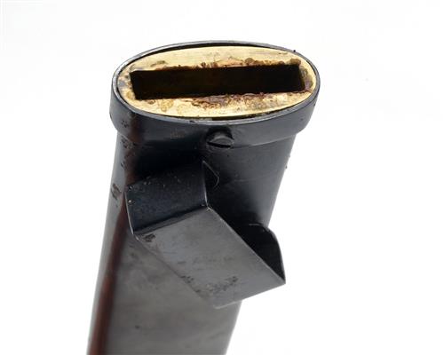 last half of the 1930's, with straight 8 1/4in. blade false edged for the last 5 1/2in., plain iron cross-guard with cranked-back quillion, plain wood finger-grooved grip held by two rivets, iron pommel-cap and complete with its blackened iron scabbard embossed with a facine and the letters 'M.V.S.N.', squared suspension loop to reverse