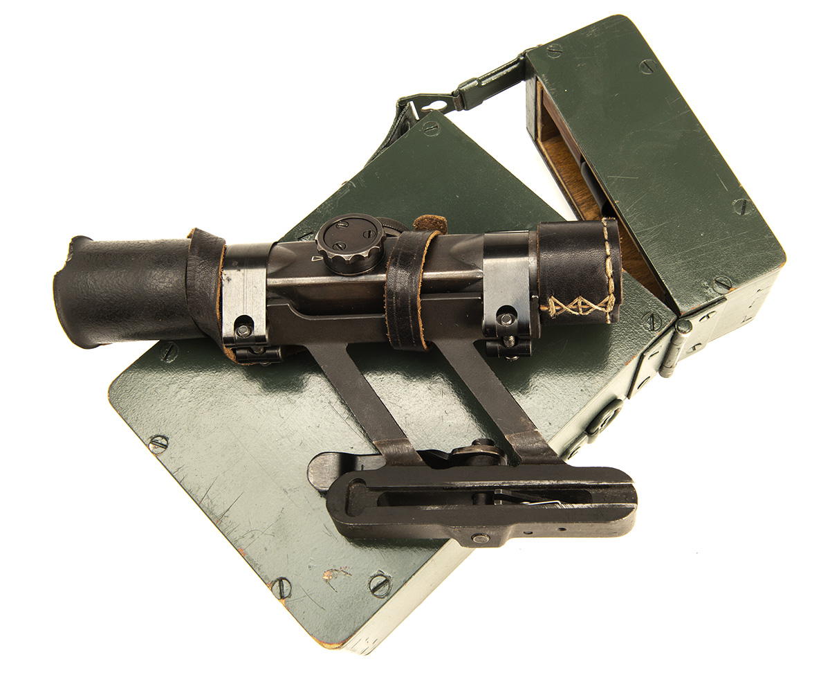 dated for 1943, with blued 24 1/2in. barrel protected fore-sight, the elevating rear-sight with side rail for a telescopic sight, blued receiver, the left hand side with further sight rail, extended wing safety to rear of bolt, laminated wood three-quarter stock, bayonet bar under muzzle and cleaning rod, fitted with a correct pattern leather sling and complete with a 'ZF41' telescopic 'Sharp-Shooter's' sight in its lozenge tin of issue and a further 'Z4' square bodied telescopic sight on a side-rail mount in a possibly reconstructed wood transit case, together with a bayonet for the same rifle (grips replaced), a canvas breech cover, a winter trigger and an issue cleaning kit in tin