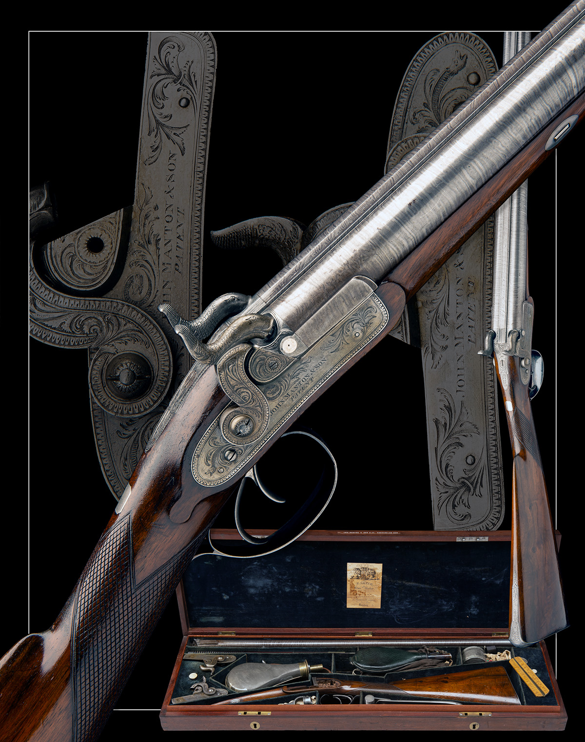 for 1825, with twist 30in. barrels (finish faded), the top-rib signed in script 'JOHN MANTON & SON' and in block letters 'DOVER STREET, LONDON', the rib-end at breech engraved with flambe needles, the underside of barrels with Charles Lancaster maker's mark, applied silver fore-sight, engraved breech-blocks with platinum vented plugs (strong traces of colour remaining), two pairs of colour hardened locks signed 'JOHN MANTON & SON, PATENT' and with border and scroll engraving with en-suite hammers, engraved raised bolsters forwards of both locks to take the side nail and fixing directly through the breech-blocks, the locks with patent scears conforming to Patent No. 4577 of 30th July 1821, walnut half-stock chequered at the wrist, engraved iron furniture including trigger-guard and heel-plate (traces of blued finish), original brass-tipped mahogany ramrod, complete in a period 'W. Smith, London' walnut storage case compartmented and lined in blue velvet and containing the gun with both sets of locks detached and a full suite of accessories including powder and shot flasks, shot bag, nipple-key, wad punch, spring cramp, ball mould, cleaning rod, spare ram-rod and three turn screws and also including a rare loose ring cap dispenser, a vintage pair of shooting gloves and a shot gauge, the inside of lid with parchment 'W. Smith' trade-label, twin lock closure (key included), the case also bearing its W. Keith Neal collection medallion numbered 'C190'