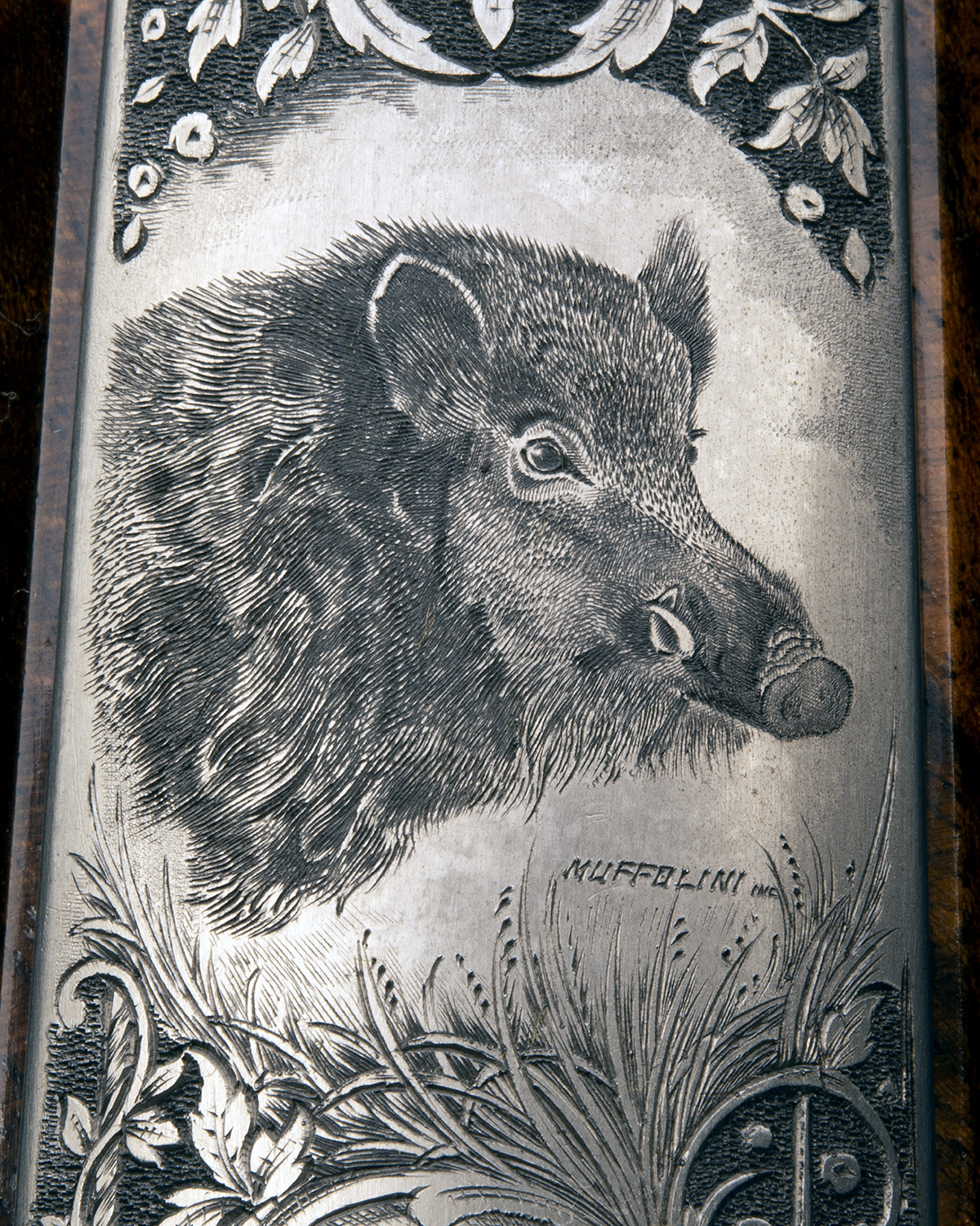 21 3/4in. nitro reproved barrel (in 2020) with deeply florally-carved sight block with chequered open sights and two folding leaf sights with gold detailing and marked '50', '100' and '150', with similarly decorated ramp-mounted bead fore-sight, the knox form carved en suite, the receiver mounted with a Swarovski PVI-2 1,25-4x24 telescopic sight, serial no. P760385609, in carved and gold-highlighted quickly-detachable mounts, the receiver and furniture fully covered with deeply carved floral and acanthus detailing, the solid sidewall gold-inlaid 'G. PRECHTL', the safety with gold-inlaid 'F' detail, florally engraved recoil blocks, hinged straddle floorplate with push release and central finely engraved portrait of a wild boar in bulino style, signed 'MUFFOLINI', highly-figured pistolgrip stock with engraved steel pistolgrip-cap (with trap), 14in. pull including fully-engraved skeletal steel buttplate, weight 7lb. 11oz. (unscoped) and 8lb. 15oz. (with scope)