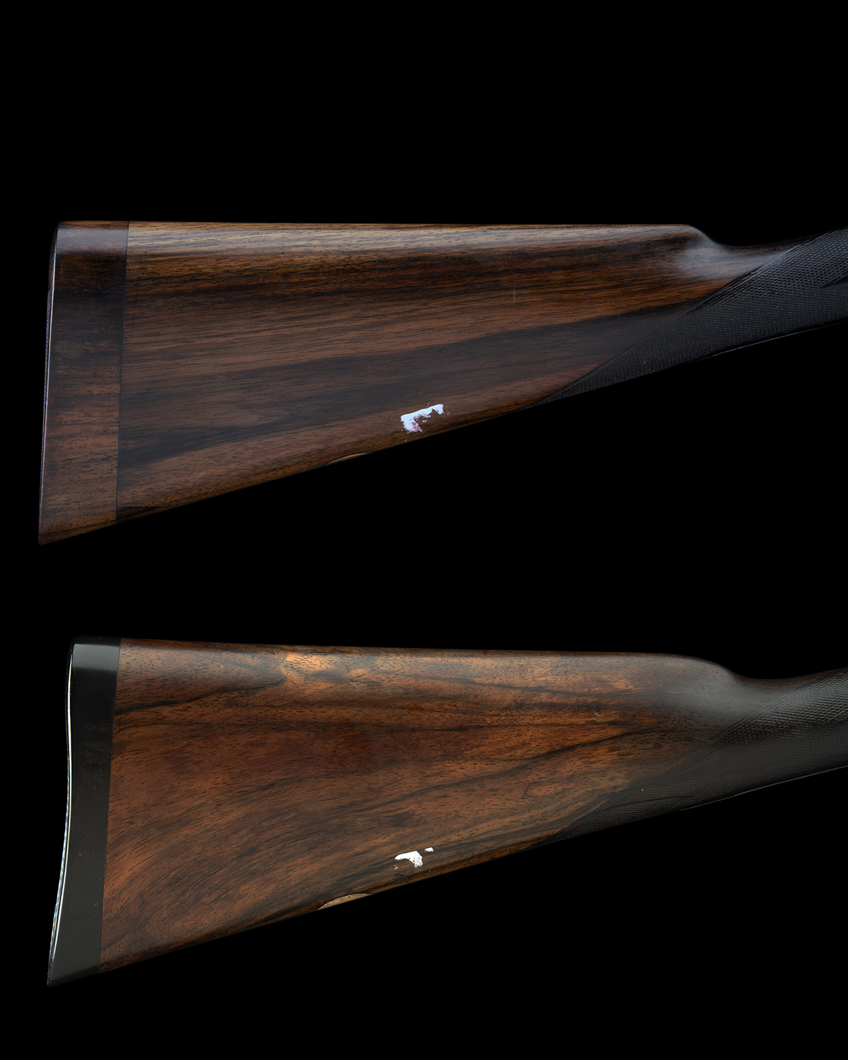 circa 1902, 28in. nitro barrels (No.2 lined, No.1 left wall at 18), the tubes engraved 'HOLLAND & HOLLAND. 98 NEW BOND STREET. LONDON. (barely legible), and gold-inlaid '1' and '2' at the breech-ends, 2 1/2in. chambers, bored approx. true cyl. choke in both (No.1) 1/4 and 1/2 choke (No.2), carved shell fences, toplevers gold-inlaid '1' and '2', automatic safeties with gold-inlaid 'SAFE' details, gold-inlaid cocking-indicators, best bold floral and scroll engraving, the undersides with cartouches engraved 'ROYAL HAMMERLESS EJECTOR', bright and blued finish overall (No.1), traces of renewed colour-hardening and finish (No.2), 14 1/2in. figured stocks including 5/8in. ebonite extension (No.1), 15in. figured stock including 1in. wooden extension (No.2), (setting cracks to rear of lockplates on both, No.1 cracked at hand), weight 6lb. 6oz. (No.1), 6lb. 12oz. (No.2)