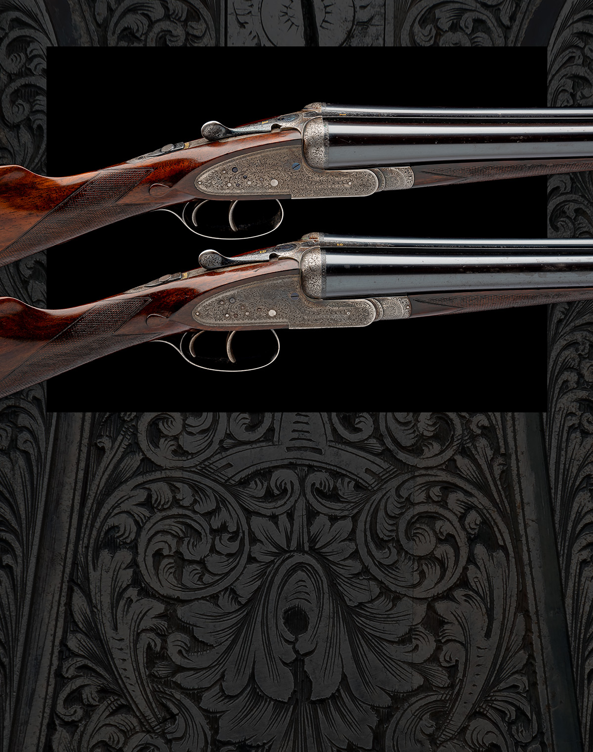 for 1929, 28in. nitro barrels, the ribs engraved 'WILLIAM EVANS. 63. PALL MALL. ST. JAMES'S. LONDON.' and with gold-inlaid '1' and '2' surrounded by acanthus scroll detailing at the breech ends, 2 1/2in. chambers, bored approx. 1/4 choke in all, treble-grip actions with removable striker discs, toplevers gold-inlaid '1' and '2', automatic safeties with gold-inlaid 'SAFE' details, best border and flowing acanthus scroll engraving, retaining traces of original colour-hardening and finish, 14 5/8in. figured stocks with engraved steel heel and toe plates, weight 6lb. 8oz., in their brass-cornered leather double guncase