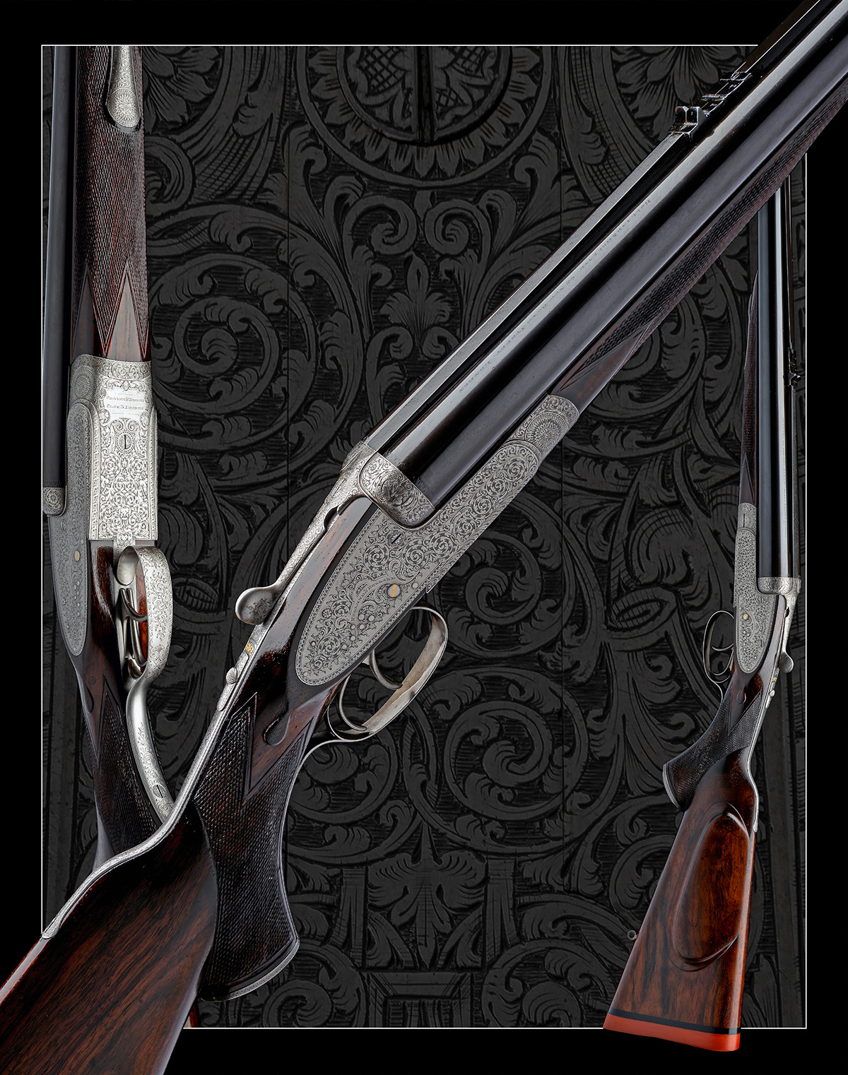 for 1897, 26in. black powder only barrels with partially file-cut rib, open sights with two folding leaf sights, marked 50/150, 200 and 300 and with white metal inlaid sight lines, ramped bead fore-sight with flip-up moonsight, the tubes engraved 'HOLLAND & HOLLAND. 98 NEW BOND STREET, LONDON', 'WINNERS OF ALL THE "FIELD" RIFLE TRIALS. LONDON', (likely refreshed), removable striker discs, elongated top strap, automatic safety with gold-inlaid 'SAFE' detail, gold-inlaid cocking-indicators, best bold Royal scroll engraving, the underside with an elaborate cartouche engraved 'CHARGES 6 DRAMS CASE 3 INCHES', 13 7/8in. figured pistolgrip stock with cheekpiece, engraved steel pistolgrip-cap, sling eyes and including 3/4in. recoil pad, fore-end with grip-catch release lever, weight 11lb., in a leather case