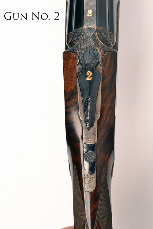 circa 1964, 27 1/2in. nitro barrels with 7mm solid matt ribs gold-inlaid '1' and '2', 2 3/4in. chambers, multichokes (with spares), hold-open toplevers pierced with dragons and gold-inlaid '1' and '2', manual safeties with gold-inlaid 'S' details, cocking-indicators, border engraving, the fences carved in relief with Olea europaea leaves and fruit on a matt background, retaining some original colour-hardening and finish, 13 3/4in. figured stocks including 1/4in. rubber recoil pad, weight 6lb. 15oz. (No.1) 6lb. 14oz. (No.2), in a tan leather double motor case