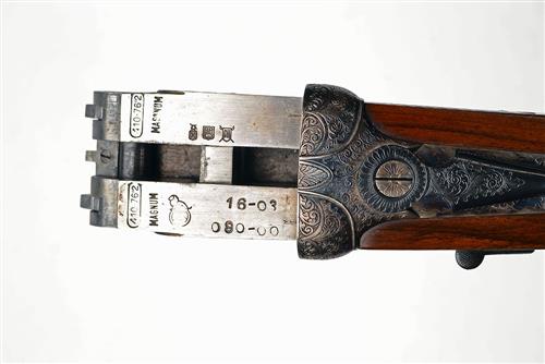 27in. nitro chopperlump barrels, 3in. chambers, bored approx. 1/4 and 1/2 choke, engraved arcaded fences, removable striker discs, automatic safety, hand-detachable lockplates, gold-inlaid cocking-indicators, articulated front trigger, rolled-edge triggerguard, fully engraved with acanthus scrollwork, retaining much original colour-hardening and finish, 14 3/4in. figured stock, weight 5lb. 4oz.