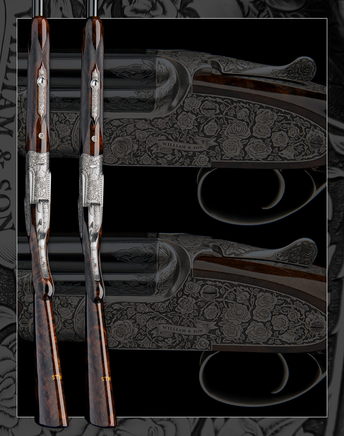 30in. nitro barrels with 7mm solid matt top-ribs, the top tubes inlaid 'WILLIAM & SON' and engraved '34-36 BRUTON STREET. LONDON.' and with flashes of foliate engraving interspersed with roses at the breech ends, 3in. chambers, Teague multichokes (with spares), hold-open toplevers engraved with rose and leaf and inlaid '1' and '2', automatic safeties with gold-inlaid 'SAFE' detail, double rolled-edge triggerguards, the actions, sideplates and furniture finely engraved with trailing roses set against a matt background, the retaining screws carved in the form of the head of a rose, the safeties carved in high relief with the head of a rose, the triggerplates signed 'Peter Cusack', 13 1/4in. highly-figured semi-pistolgrip stocks cast for a left-hander, the stocks inlet with the initials 'STM' in gold, weight 6lb. 3oz. (No.1) 6lb. 4oz. (No.2), in their makers leather double motorcase with canvas outer and a complement of accessories