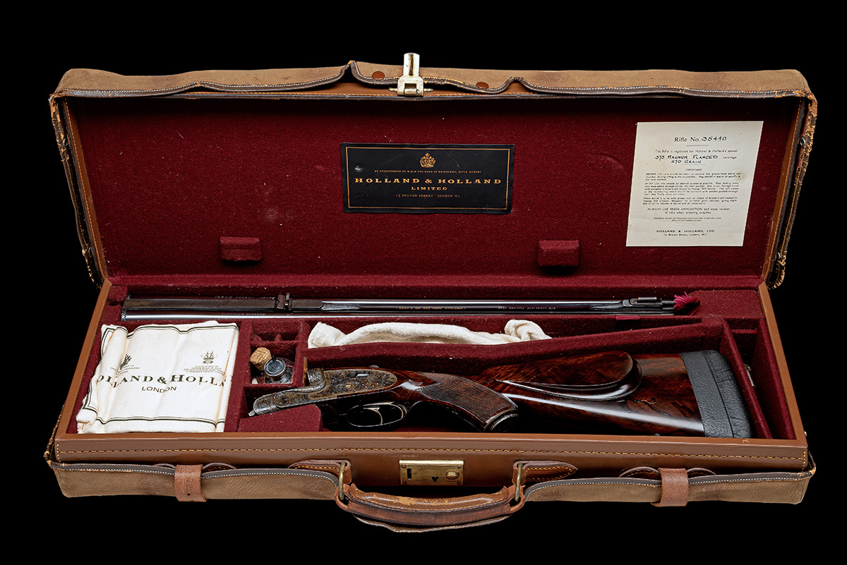 for 1966, 24in. nitro reproved chopperlump barrels with matt sight rib, open sights for 50 and 200 yards with folding leaf sight for 350 yards, matt ramp-mounted bead fore-sight with fold-over protector with integral moonsight, sunken rib engraved '.375 "MAGNUM" FLANGED CTGE.' and gold-inlaid '-SPECIALLY MADE FOR MR Y HARA-', tubes engraved 'HOLLAND & HOLLAND. 13. BRUTON STREET, LONDON.', treble-grip action with side-bolsters and hidden third bite, removable striker discs, elongated top strap with automatic safety and gold-inlaid 'SAFE' detail, hand-detachable lockplates, gold-inlaid cocking-indicators, chequered articulated front trigger, rolled-edge triggerguard, the fences deeply carved in relief with stylised dragons, the action, lockplates and furniture profusely engraved with bold stylised acanthus and foliole motifs interspersed with mythical beasts and serpents, the underside with the Green Man, with the makers name and model designation interwreathed on the action bar, the crosspin with central floral motif encircled 'MADE IN ENGLAND', retaining virtually full original colour-hardening and finish, 14 1/2in. highly-figured pistolgrip stock with cheekpiece and monte carlo comb, steel pistolgrip-cap (with trap) engraved with a further Green Man and retaining virtually full colour-hardened finish, sling swivels, including 1in. leather covered extension and 7/8in. leather covered recoil pad, weight 9lb. 4oz., in its lightweight leather case with accessories and canvas outer